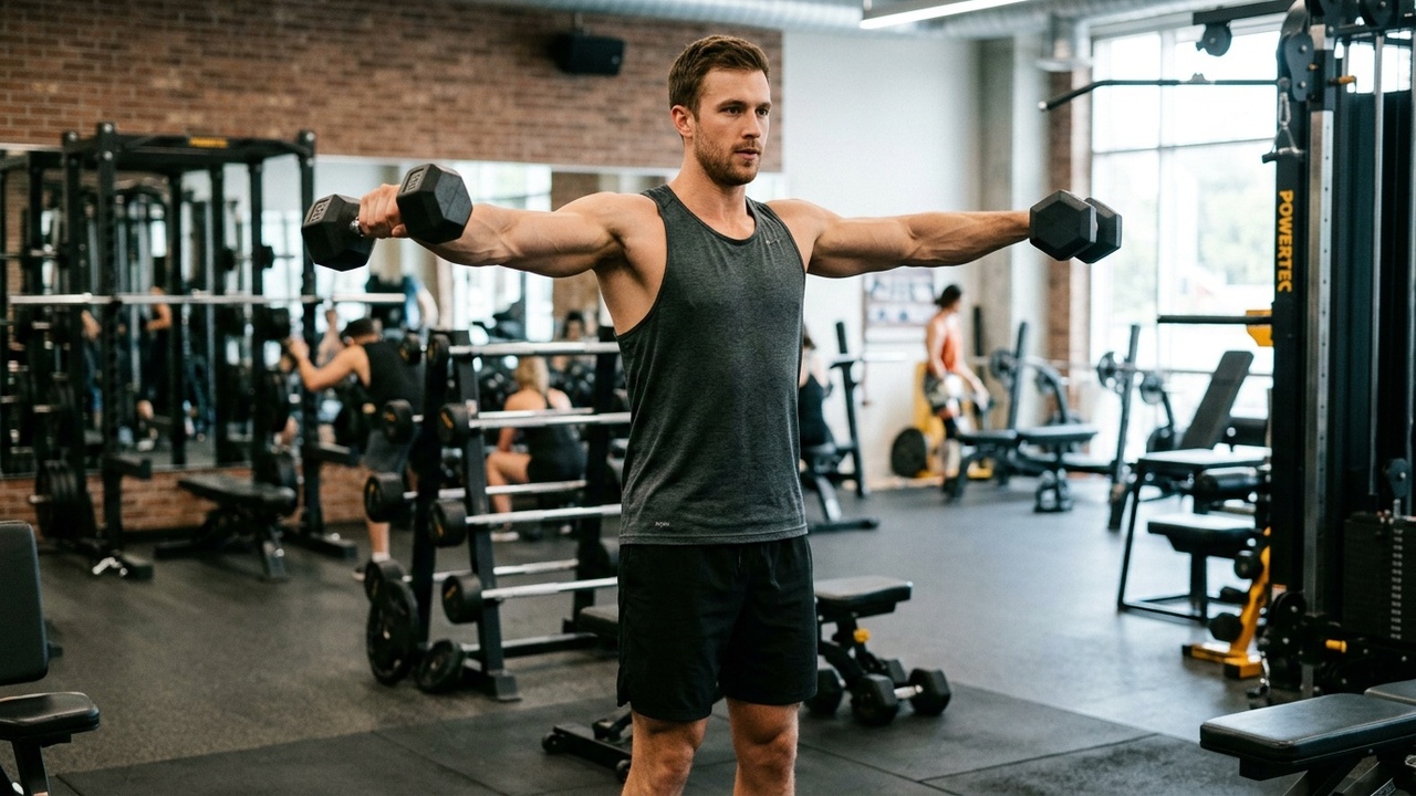 The lateral raise is the single most important exercise for shoulder width. Stand with dumbbells at your sides, palms facing inward. Raise the dumbbells out to the sides until your arms are parallel to the floor, leading with your elbows rather than your hands. Lower slowly and repeat.