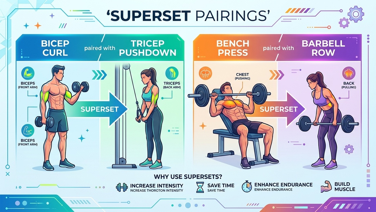 - Supersets: Two exercises performed back-to-back with no rest between them. Save time, increase metabolic stress, and maintain intensity.