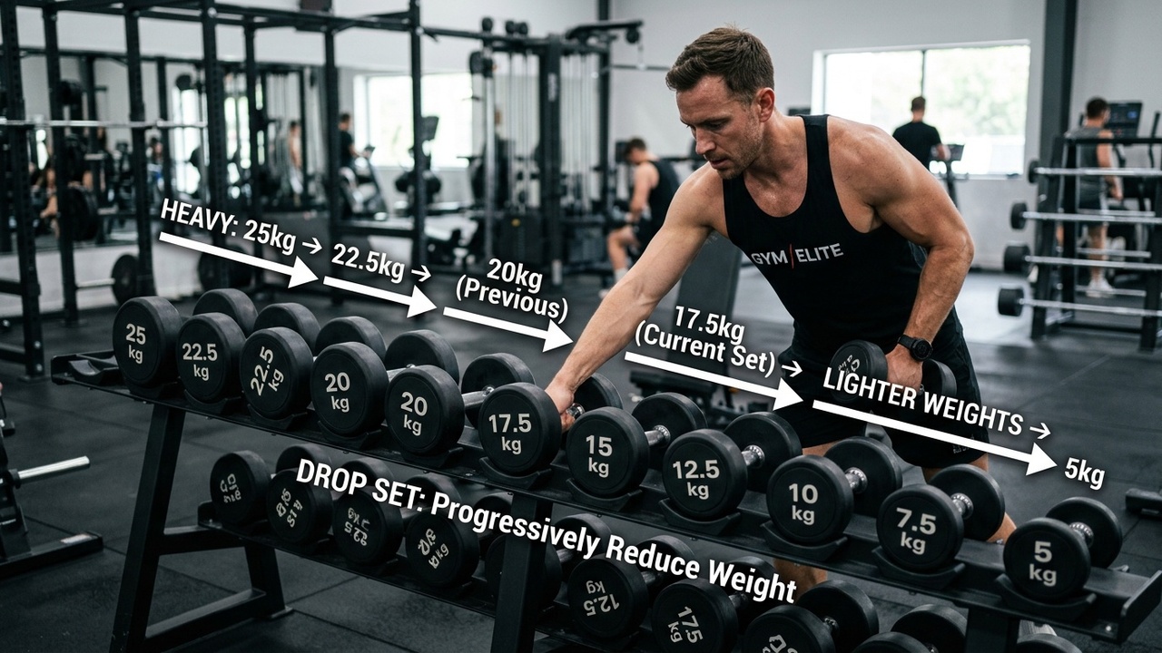 A drop set is a technique where you perform an exercise to failure (or near failure), immediately reduce the weight by 20-30%, and continue performing reps without rest. You can "drop" the weight once, twice, or three times within a single extended set.